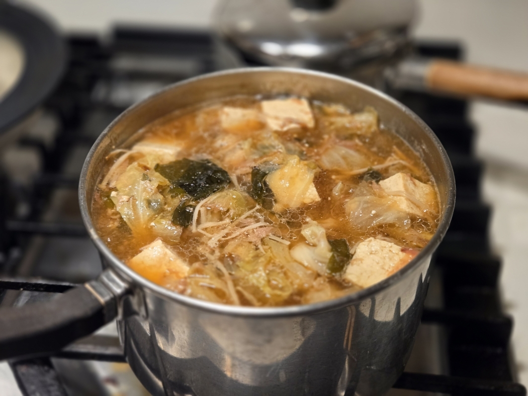 | 1週間の自炊生活の始まり!毎日作るのは面倒なので3日分程の具沢山の味噌汁を作ってみたがボチボチの味だ |