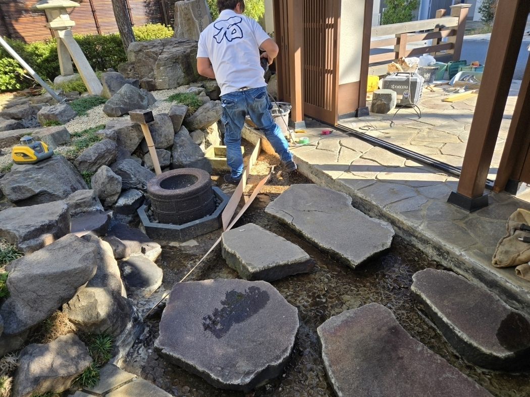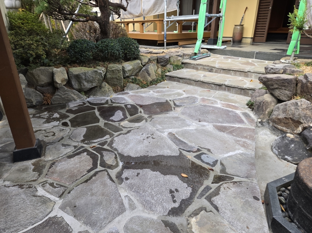 | 鉄平石のリニューアル工事が終わっていたが?昨夜の雨で確認だが水捌けが悪い、水勾配の一寸の違いで起きる |