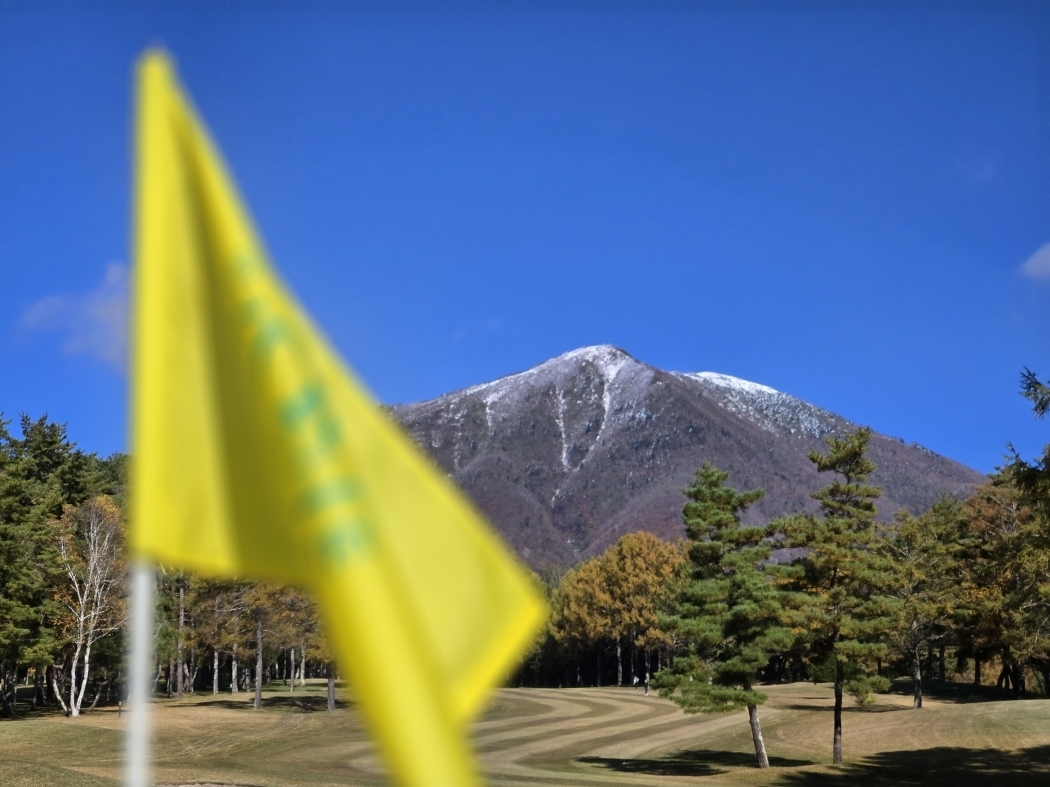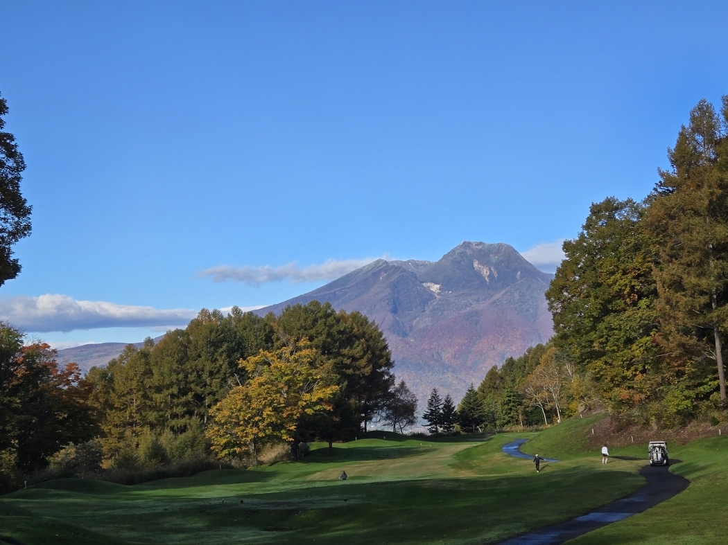 | 斑尾東急ゴルフクラブ10番ホールからの妙高山!山頂付近は薄化粧(初雪)だったが昼には消えた紅葉が盛り |