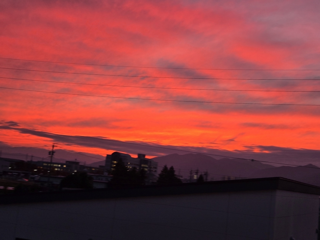 | 今日はビーバー満月だというが!薄曇りで月は観ることが出来ないが夕焼けが眼に痛いほど美しさを誇っている |