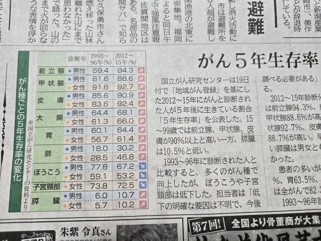 | 二人に一人が患う時代となってるそうだが!癌5年生存率が格段と上昇しているが部位によっての差が気になる |