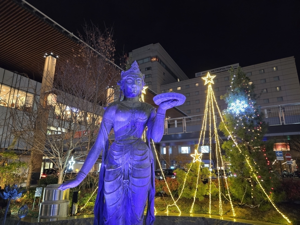 | 長野駅の如是姫が紫のライトで照らされていた!やかの会忘年会を「さがみ駅前店」の開催でJRを久々の利用 |